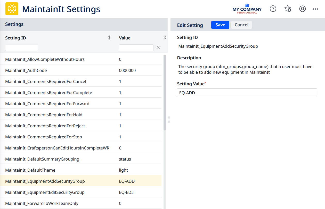 The ability to add and edit equipment are controlled by separate security groups.  By default, those groups are EQ-ADD and EQ-EDIT respectively.  There are settings to change which security group to use for controlling add and edit permissions. Those settings are *MaintainIt\_EquipmentAddSecurityGroup* and *MaintainIt\_EquipmentEditSecurityGroup*. See the [Settings ](https://maintainit.imaginitfm.com/system-administration/settings)section for more information on how to change those.