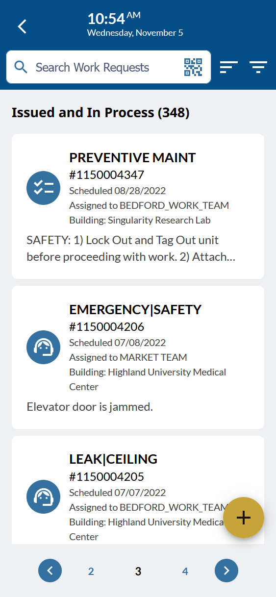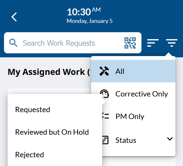 Tap the search box and begin typing to start searching the Work Requests in the current list. Alternately, you can tap the QR Code icon to scan a barcode or QR code with your device camera and search from the scanned value. The search box will perform a fuzzy search (matching parts of words) for the following fields: