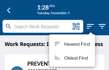 By default, the newest Work Request are shown first.  If you would prefer to see the oldest first, tap the sort icon to the immediate right of the search box and select that option.