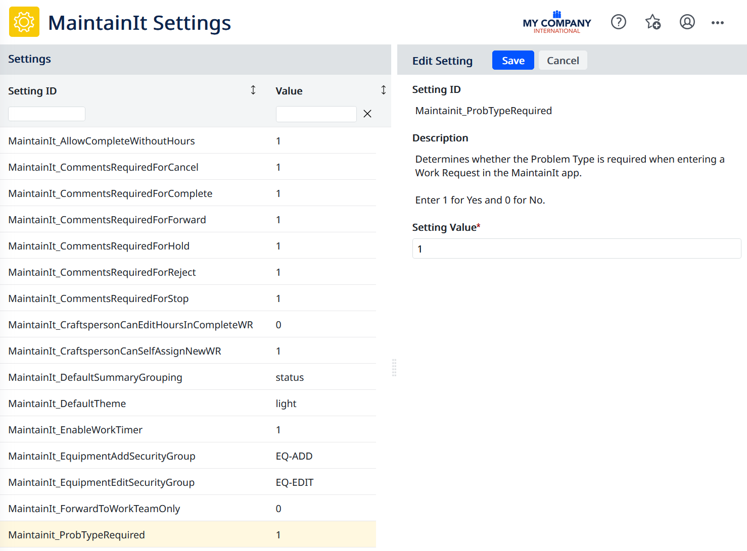 MaintainIt recognizes some Archibus settings that also apply to the Maintenance Console in Web Central, such as the *ShowPartsInWrDetails* and *ShowProblemTypesOnReportProblem* parameters.  The MaintainIt Settings view lets you update these all in one place.  Settings specific only to MaintainIt will have Setting IDs that start with "MaintainIt\_".